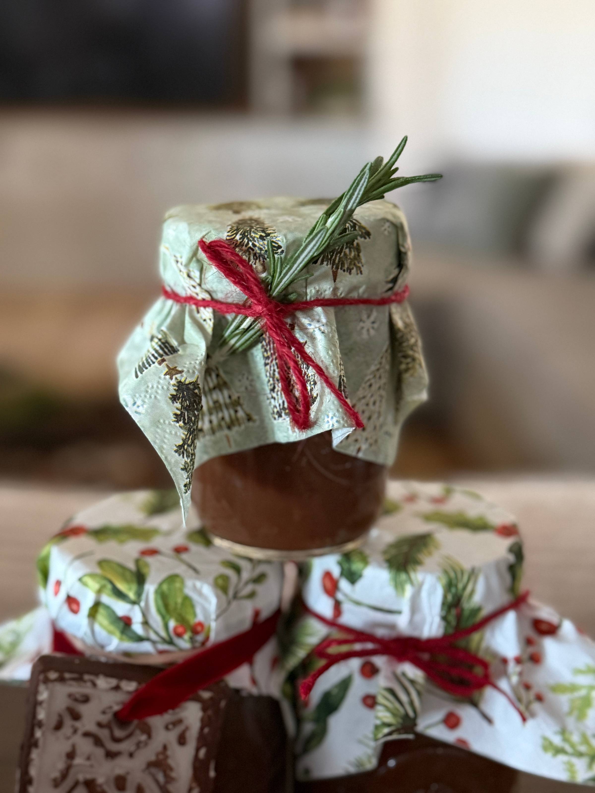 TIP: If you don’t have fabric scraps to wrap around your canned jars (like apple butter), use printed Christmas napkins (that I’m sure you already have). One napkin will cover 4 jars. Just cut in a square, place it over the lid and tie a ribbon on it. Add a gift tag and you have a cute gift. Make a batch of buttermilk sourdough biscuits to go alongside with it and now it’s an even yummier gift!