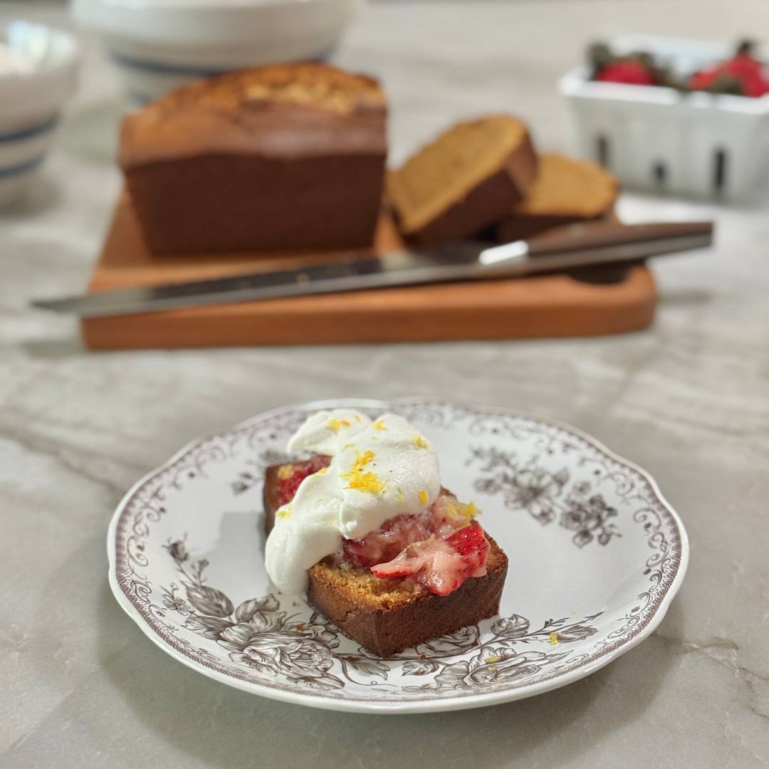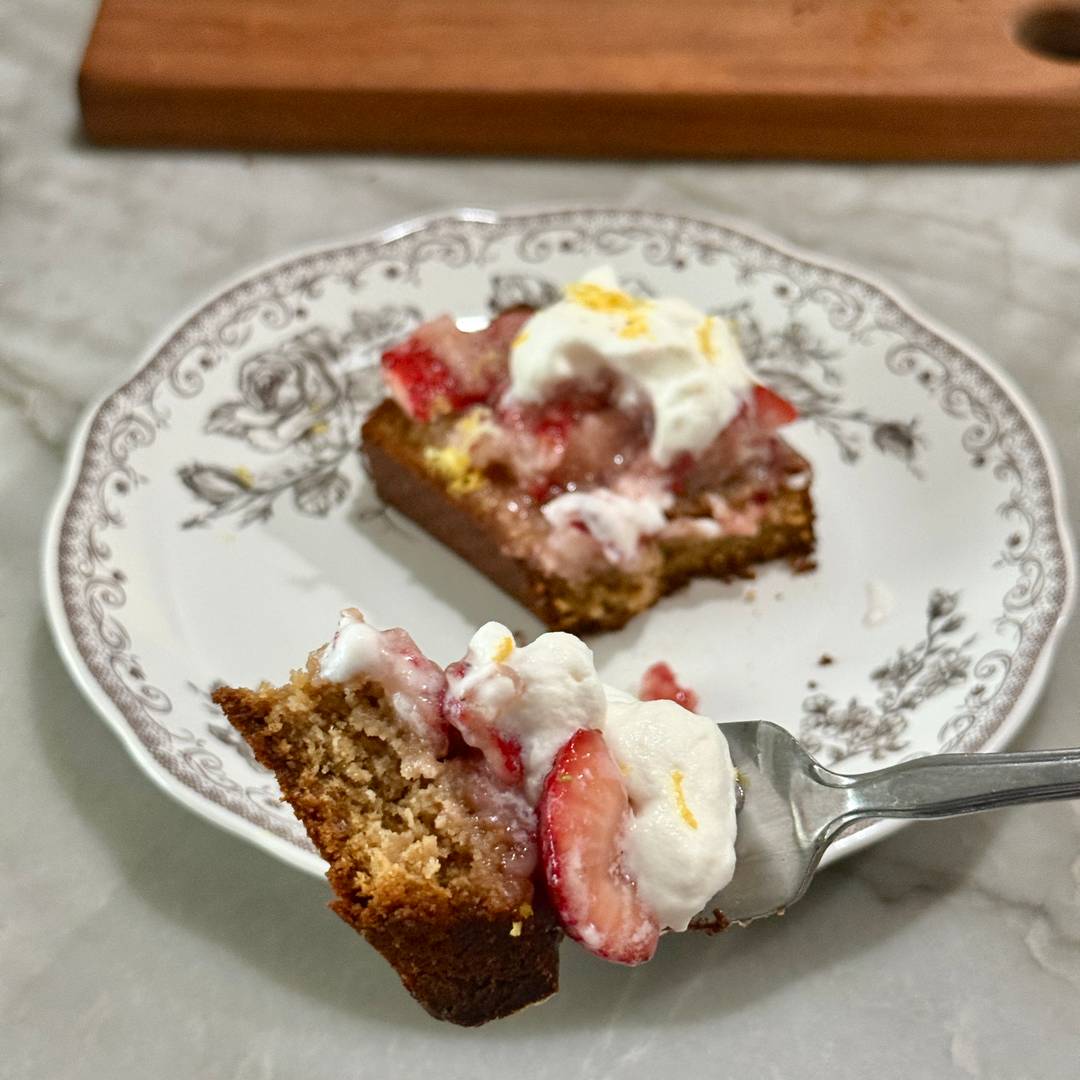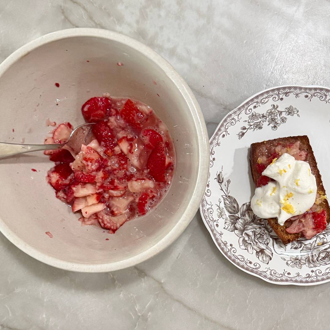 Once the pound cake is cooled, cut it into slices. Meanwhile, mash your strawberries, creating a juice. Adding sugar is optional. I like drizzling maple syrup while mashing them. Scoop the strawberry mixture on top of a slice of pound cake, then top it with homemade whipped cream. Add a little lemon zest and oh my, you have a yummy treat! Sharing with others is optional haha.
